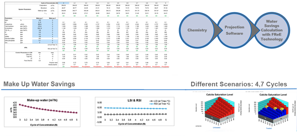 Figura 2 - Software y herramientas de proyección para analizar la química del agua y calcular el ahorro de agua manteniendo la seguridad del sistema. En el ejemplo (Industria de Procesamiento de Aire) los ciclos de concentración se incrementan de 4 a 4,7 conduciendo a 8,5% de ahorro de agua.