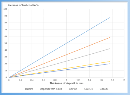 Figura 2 - Diferentes espesores de depósitos y aumento de los costes de combustible (%) - Efecto de las incrustaciones en el proceso de refrigeración en los rellenos del sistema de refrigeración.
